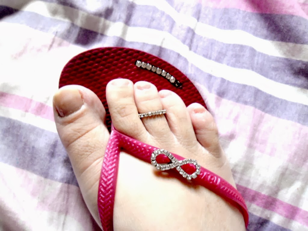Não reparem meus pés não estão feitos nessas fotos...Só queria mostrar pra vocês que fofo meu novo anel de dedo de pé...e olha como ficou luxuoso com meu chinelinho em strass...